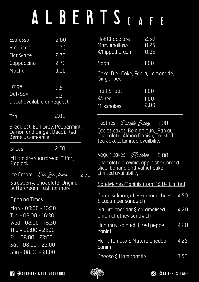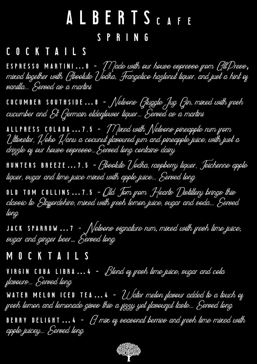 Welcome to Alberts Cafe, a delightful gem nestled in Victoria Park, Stafford. This charming cafe offers an inviting atmosphere with both cozy indoor seating and pleasant outdoor tables boasting fantastic views. The menu is a carefully curated selection that boasts artisan coffee roasted by Allpress, alongside refreshing cocktails like the Espresso Martini and Allpress Colada.